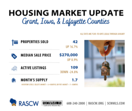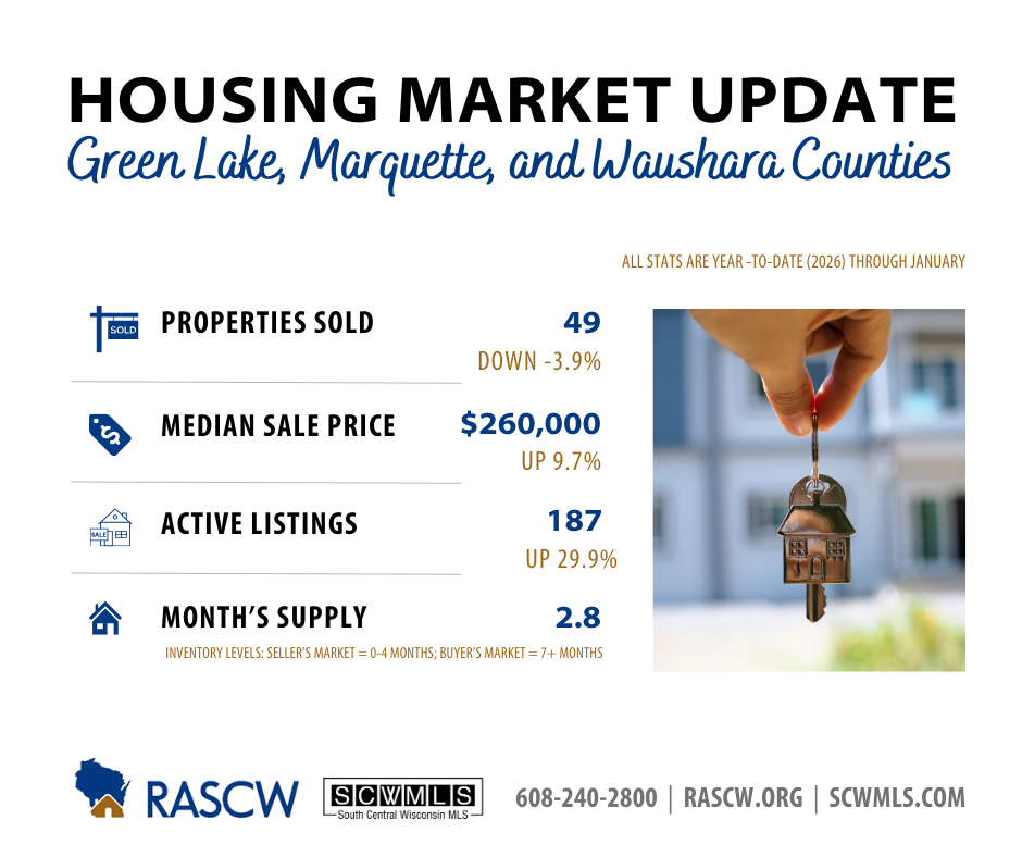 Dane County: January sales softened slightly year over year, dipping from 315 in 2025 to 312 in January 2026 (-1.0%). Despite the minor decline, sales remain near recent highs, suggesting buyer demand has stabilized at a stronger baseline.