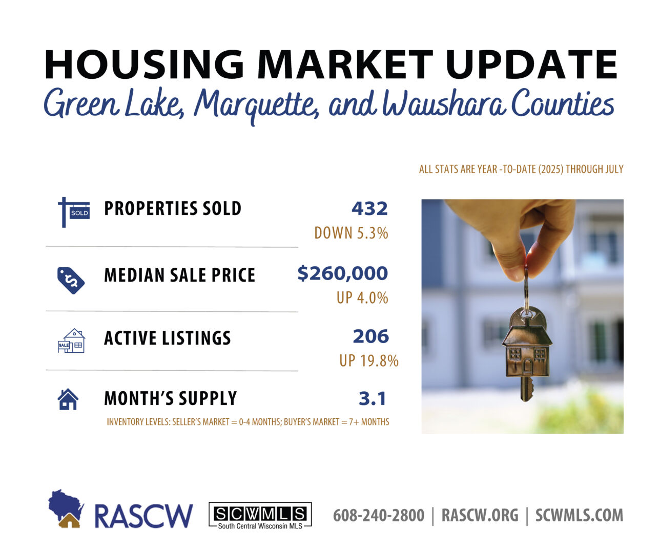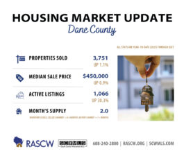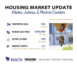 The South Central Wisconsin housing market showed mixed results in July, with regional new listings rising 3.1% compared to last year, bringing the year-to-date increase of new listings to 5.5%. Total active residential listings are up 25.8% across the region providing more options for Buyers than a year ago.
