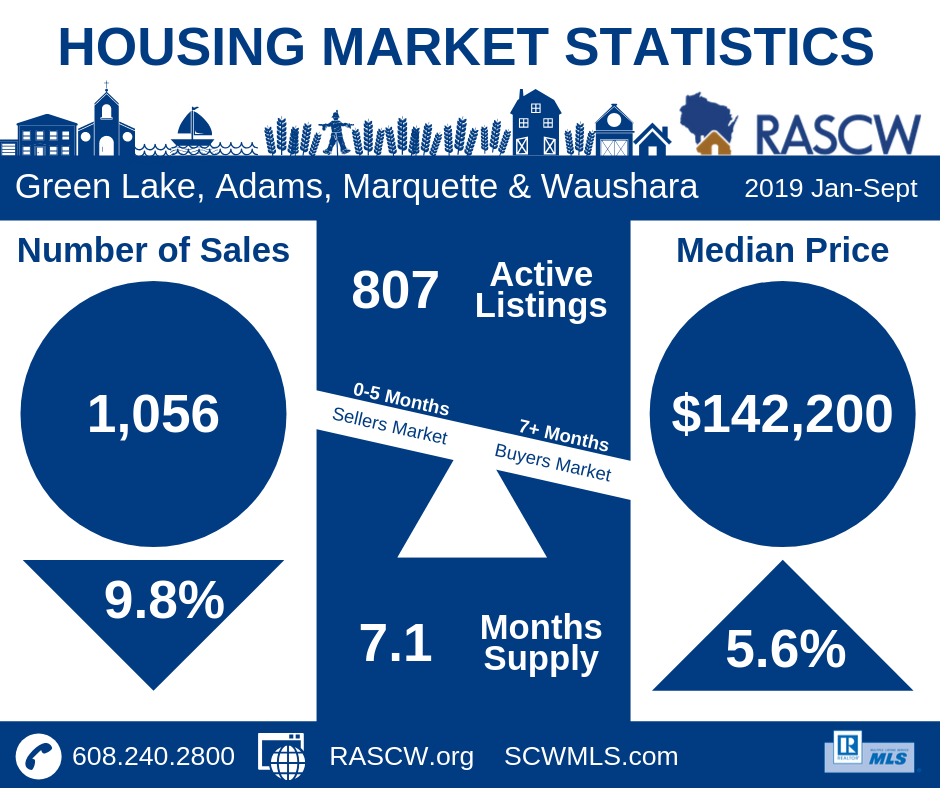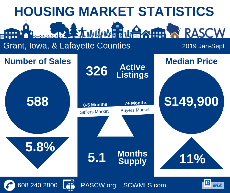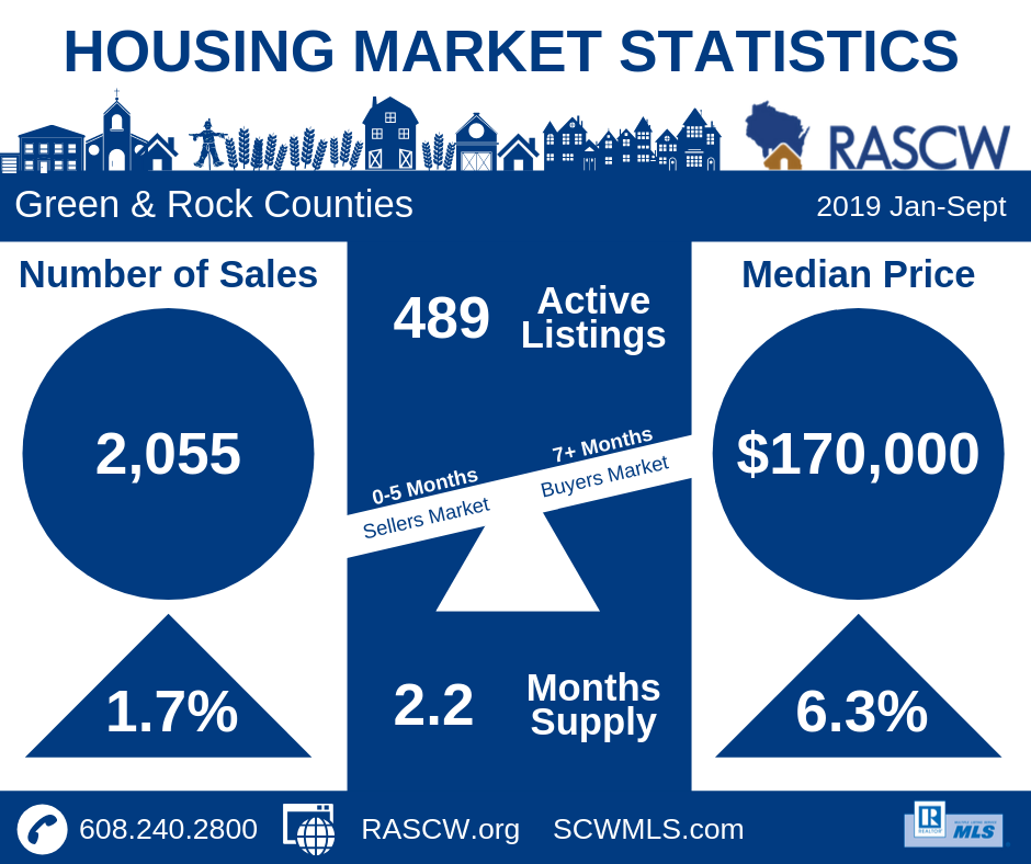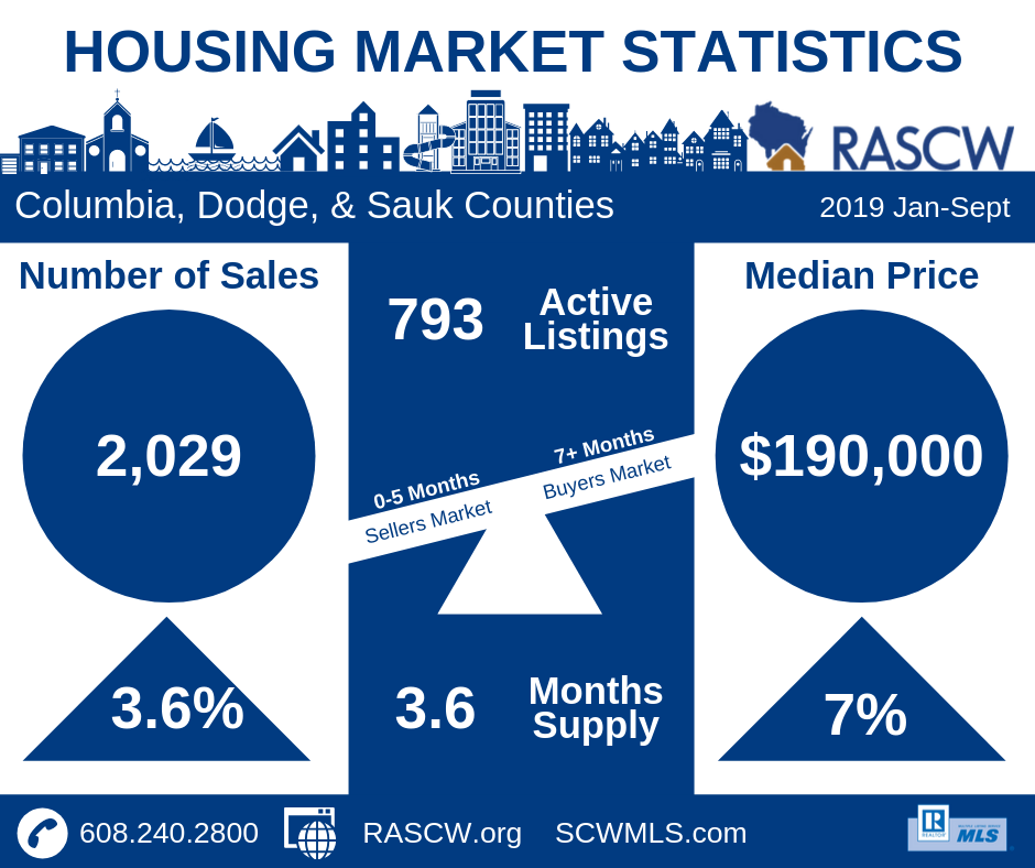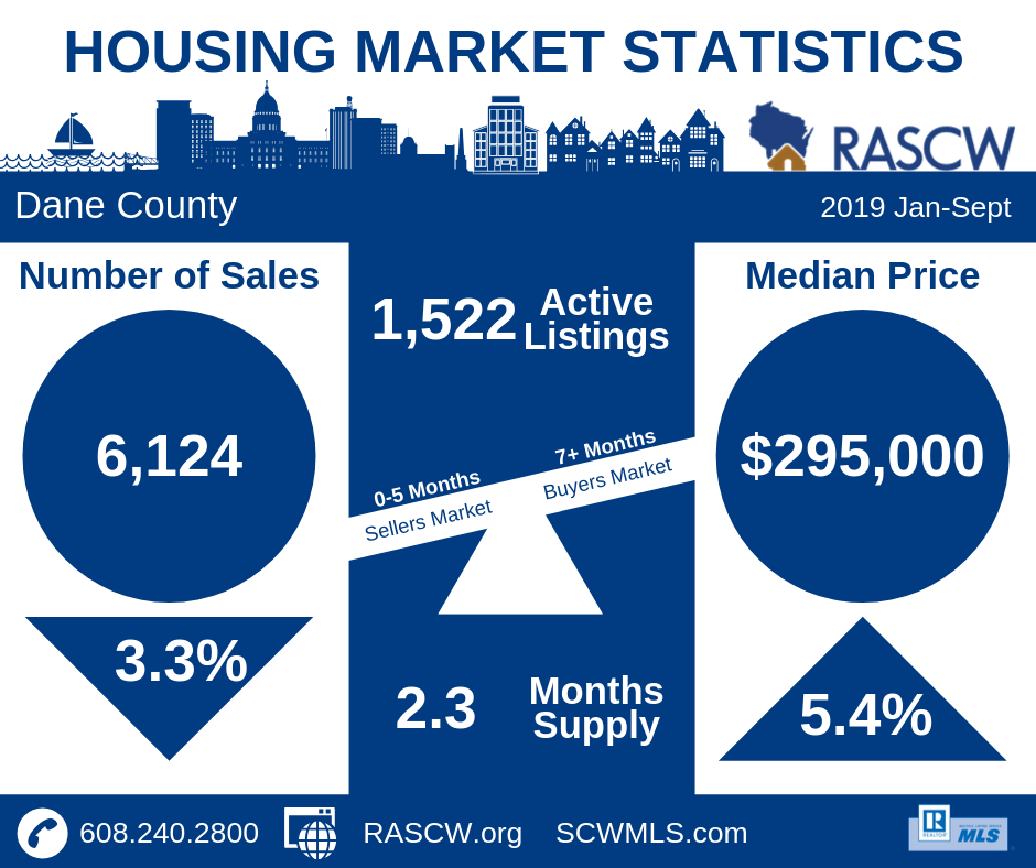 For the month of September, the number of sales in Dane County were 2% above 2018 numbers at 602 sales. Year to Date (Jan-Sept) sales totaled 6,124 which is a reduction of 3.3% from the same time period last year. Inventory continues to tighten at 2.3 months across all price sectors. Homes priced under $350,000 have even less inventory starting at under 1.6 months. According to the National Association of REALTORS®, national inventory is just over 4 months and a balanced market is considered to be around 6 months…(more)